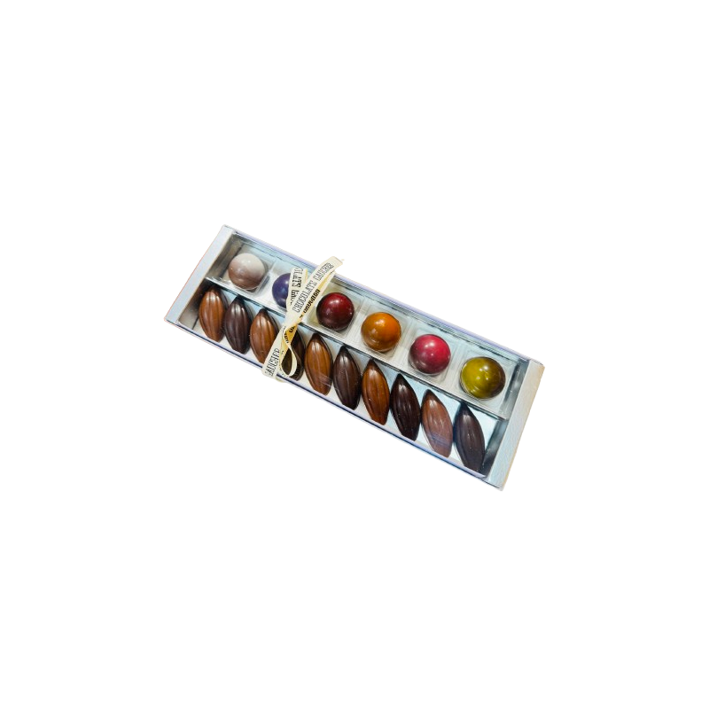 Composé de 10 cabosses au praliné chocolat lait et noir et des 6 demi sphères de la Maison Gaucher Chocolatier.