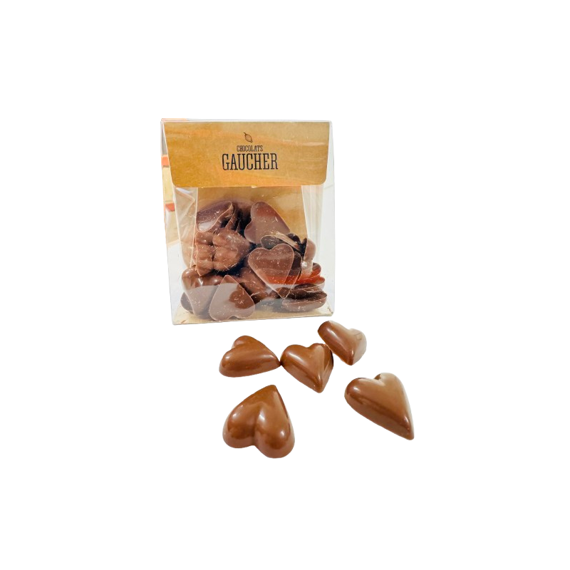 Pochette coeurs chocolat noir et lait 150g. Chocolat noir à 64% et chocolat lait 48% de cacao.