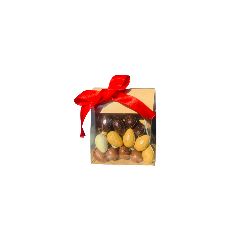 Coffret composé de 200g d'œufs fondant à la noisette chocolat noir, lait, blanc et caramel.