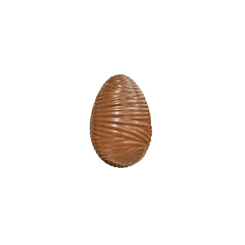 Venez découvrir en boutique le nouvel Œuf Design, au chocolat noir ou chocolat lait, garni de friture chocolat noir, lait, blanc et caramel.