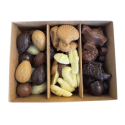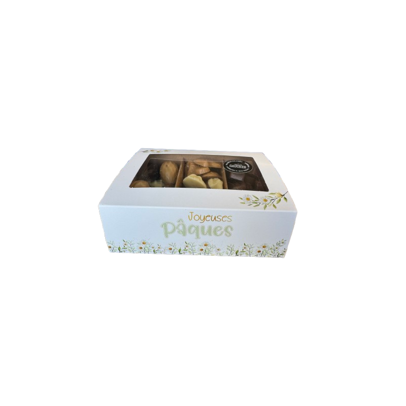 Découvrez le coffret Délices de Pâques, garni d'œufs fondants noisette, de friture chocolat noir, lait, blanc et caramel et de friture fourrée au praliné noisette croustillant chocolat noir et lait